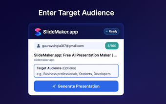 Med funktioner som smart innehållsstrukturering, flera designalternativ och direktleverans av presentationer via e-post, erbjuder SlideMaker en användarvänlig lösning för alla som arbetar med presentationer. Användare kan enkelt konvertera upp till 15 presentationer per dag gratis och exportera dem i både PPTX- och PDF-format. Med dess fokus på sekretess och säkerhet kan användare känna sig trygga i att deras data är skyddad.